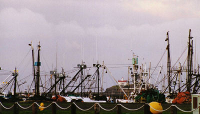 View from the lodge looking at the commercial fishing boats in the harbor and Battery Point Lighthouse in the background. And Tom Wyllie standing next to quartered curly redwood log in 1952